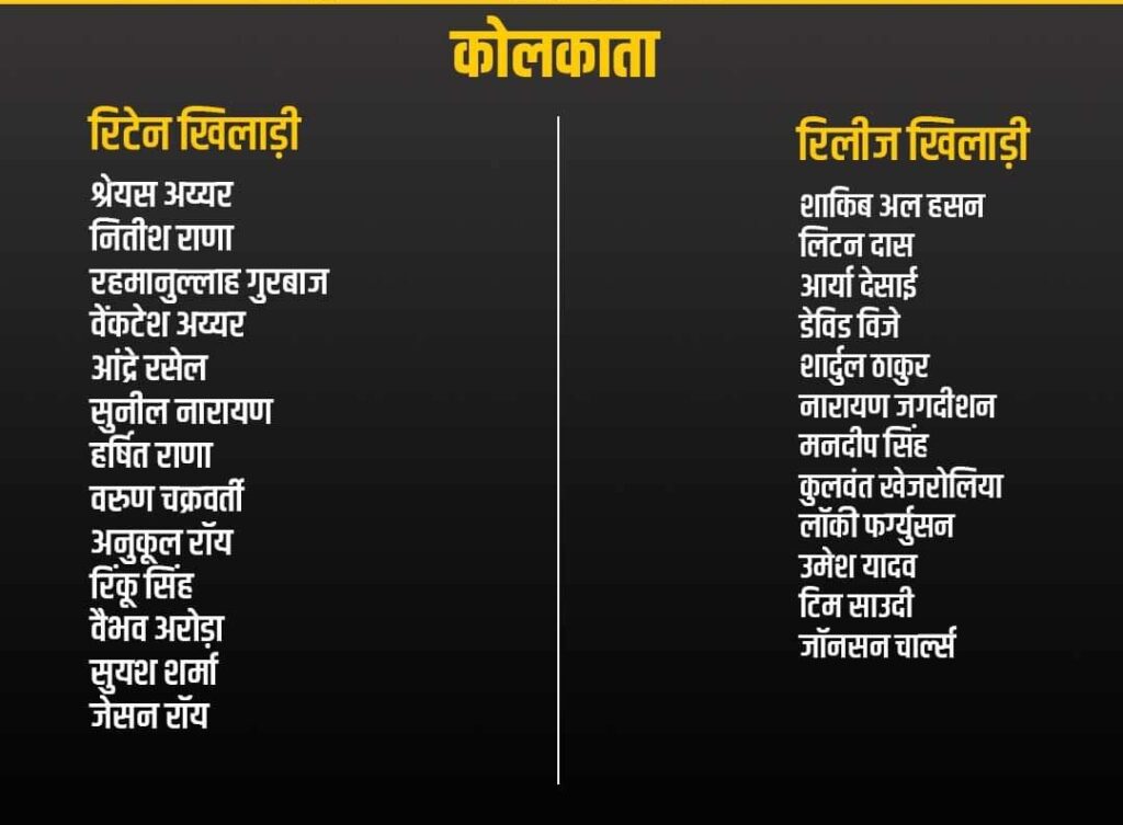 नितीश राणा, रहमानुल्लाह गुरबाज़, वेंकटेश अय्यर, आंद्रे रसेल, सुनील नरेन, हर्षित राणा, वरुण चक्रवर्ती, अनुकूल रॉय, रिंकू सिंह, वैभव अरोड़ा, सुयश शर्मा, जेसन रॉय।